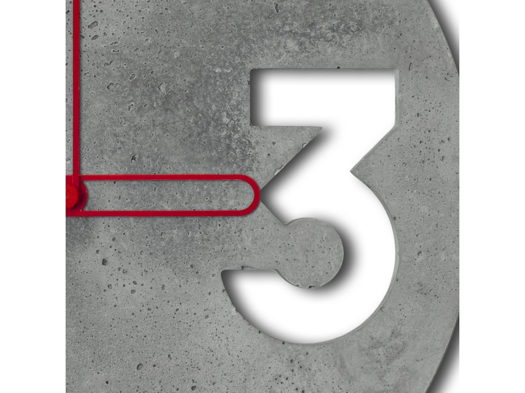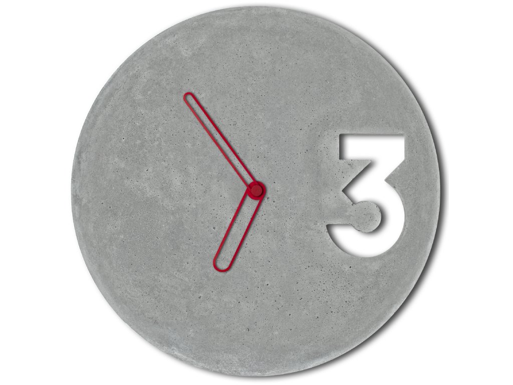 Betonový ciferník s vyraženým číslem 3, lakované hliníkové rafičky, kvalitní německý strojek zaručující tichý chod. Co dodat? Snad jen, že AA baterie není součástí balení.