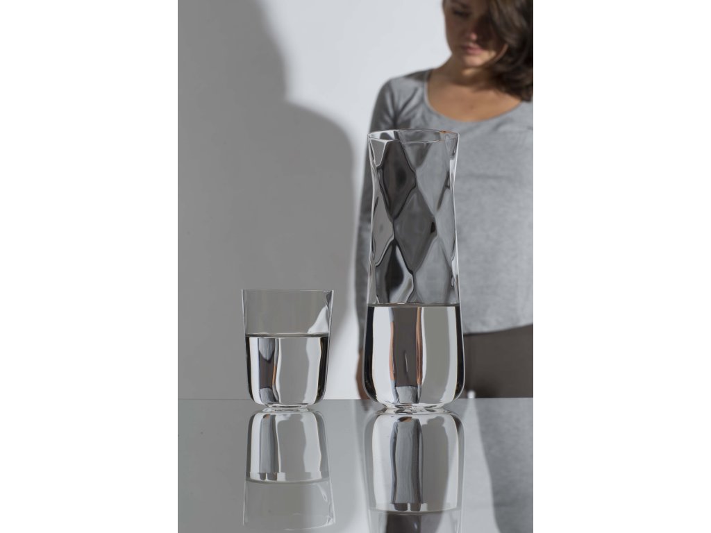 Celý set (2 sklenky a karafa) vznikl pod rukama zručných sklářů, kteří pokračují v řemesle svých pradědů. Na výběr z varianty Pure a Twist v různých objemech karaf a sklenek. Twist využívá staré techniky optického “tordování”, která se propsala do současného designu elegantní karafy a sklenek. Je malým kouzlem – povrch je zvenčí dokonale hladký. Hra spirál se odehrává uvnitř a v průhledu vytváří síť kosočtverců, které však zmizí, jakmile karafu a sklenky naplníte vodou. Karafa a sklenky nejsou jen elegantní, svůj civilní luxus naplňují i praktickou skladebností. Obě sklenky jsou štosovatelné do sebe a do hrdla karafy.